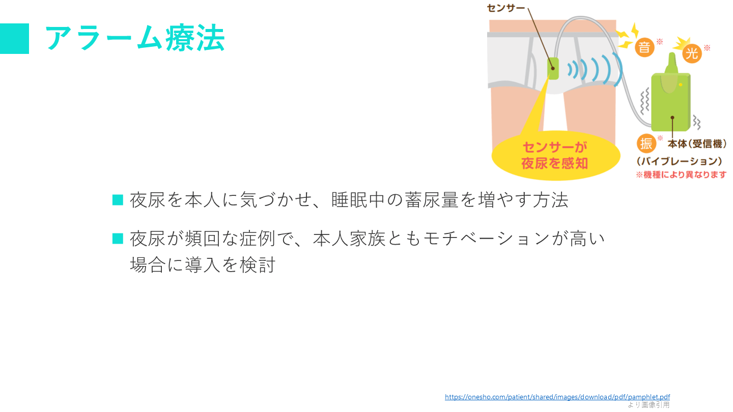 アラーム療法が不適当な症例や、アラーム療法を希望しない症例