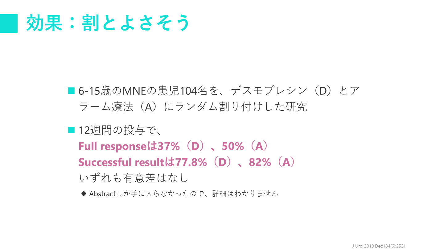 #26. 効果:割とよさそう J Urol 2010 Dec;184(6):2521 6-15歳のMNEの患児104名を、デスモプレシン(D)とアラーム療法(A)にランダム割り付けした研究