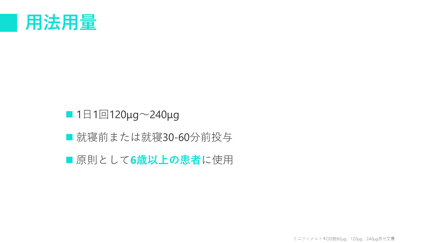 #27. 用法用量 ミニリンメルト®OD錠60μg、120μg、240μg添付文書 1日1回120μg~240μg