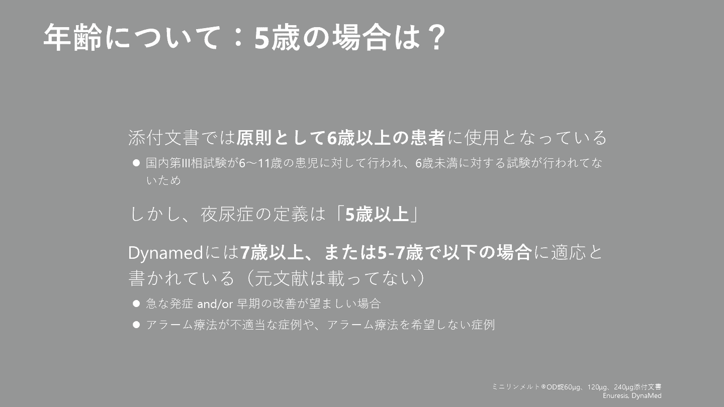Enuresis, DynaMed 添付文書では原則として6歳以上の患者に使用となっている