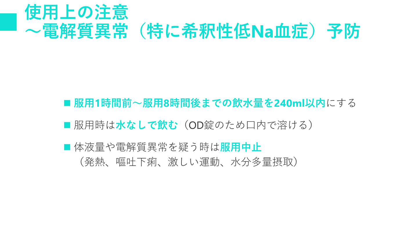 体液量や電解質異常を疑う時は服用中止(発熱、嘔吐下痢、激しい運動、水分多量摂取)