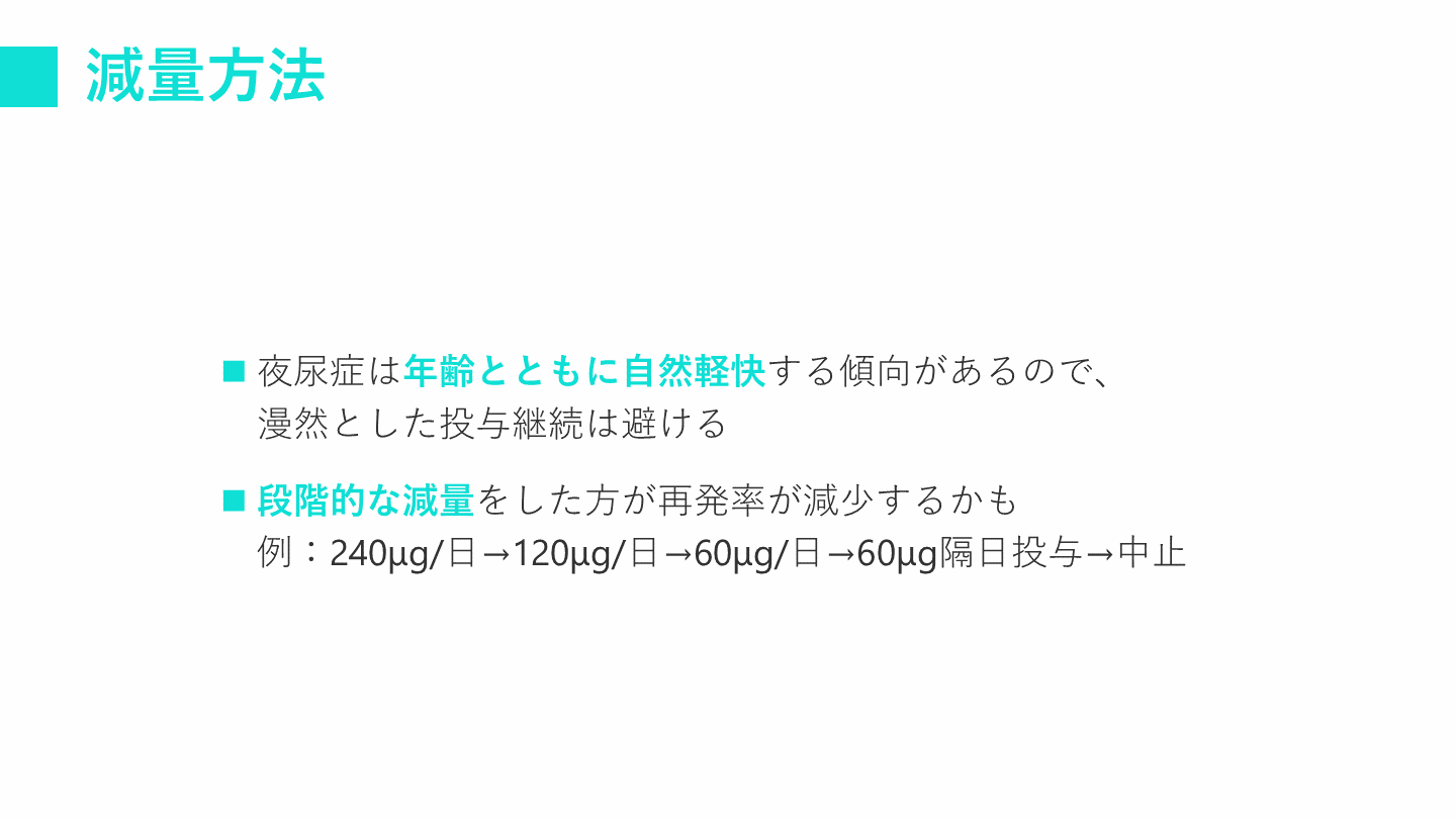 #31. 減量方法 夜尿症は年齢とともに自然軽快する傾向があるので、漫然とした投与継続は避ける
