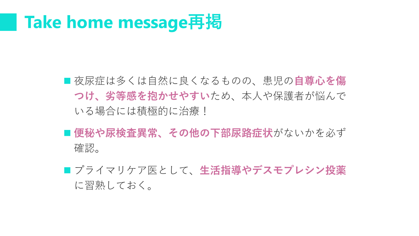#33. Take home message再掲 夜尿症は多くは自然に良くなるものの、患児の自尊心を傷つけ、劣等感を抱かせやすいため、本人や保護者が悩んでいる場合には積極的に治療!