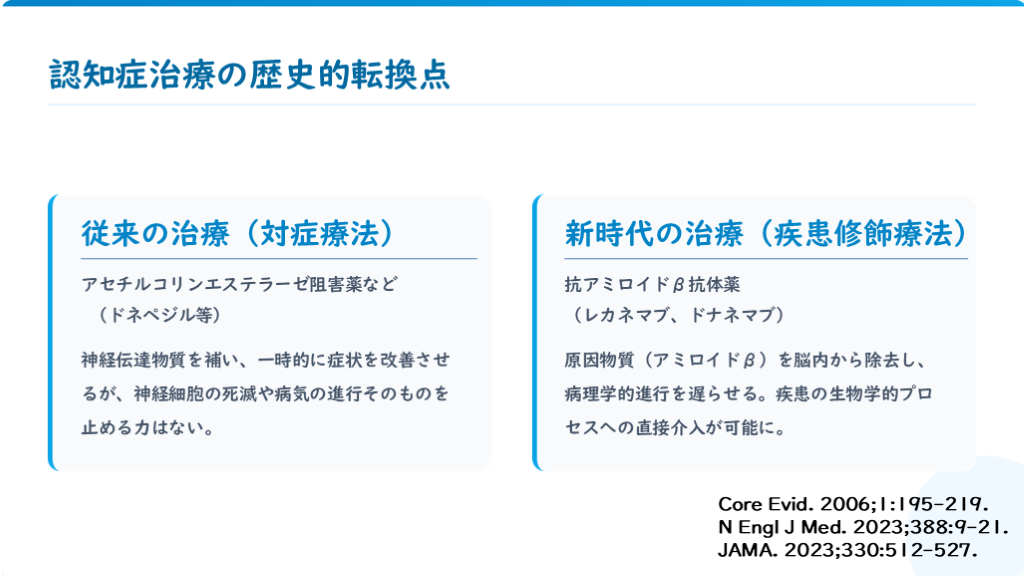 #2. 認知症治療の歴史的転換点 従来の治療 (対症療法) アセチルコリンエステラーゼ阻害薬など (ドネペジル等) 神経伝達物質を補い、一時的に症状を改善させるが、神経細胞の死滅や病気の進行そのものを止める力はない。 新時代の治療 (疾患修飾療法) 抗アミロイドβ抗体薬