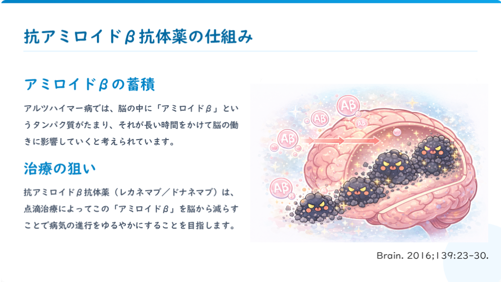 #3. 抗アミロイドβ抗体薬の仕組み アミロイドβの蓄積 アルツハイマー病では、脳の中に「アミロイドβ」というタンパク質がたまり、それが長い時間をかけて脳の働きに影響していくと考えられています。 治療の狙い 抗アミロイドβ抗体薬(レカネマブ/ドナネマブ)は、点滴治療によってこの「アミロイドβ」を脳から減らすことで病気の進行をゆるやかにすることを目指します。 Brain. 2016;139:23-30.