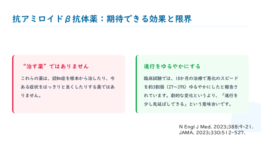 #5. 抗アミロイドβ抗体薬:期待できる効果と限界 “治す薬”ではありません これらの薬は、認知症を根本から治したり、今ある症状をはっきりと良くしたりする薬ではありません。 進行をゆるやかにする 臨床試験では、18か月の治療で悪化のスピードを約3割弱(27〜29%)ゆるやかにしたと報告されています。劇的な変化というより、「進行を少し先延ばしできる」という意味合いです。 N Engl J Med. 2023;388:9-21.