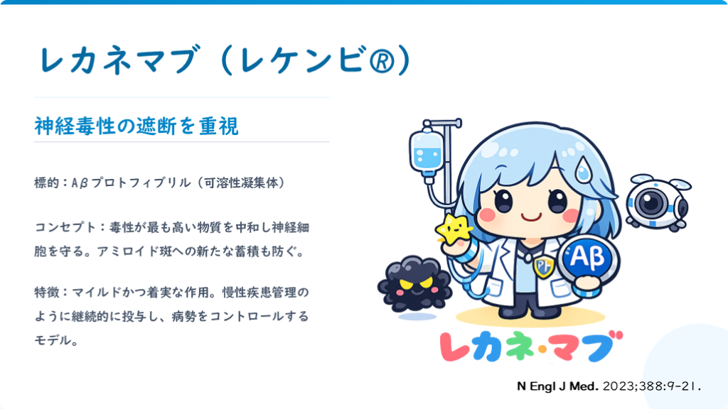 #6. レカネマブ (レケンビ🄬) 神経毒性の遮断を重視 標的:Aβプロトフィブリル(可溶性凝集体) コンセプト:毒性が最も高い物質を中和し神経細胞を守る。アミロイド斑への新たな蓄積も防ぐ。 特徴:マイルドかつ着実な作用。慢性疾患管理のように継続的に投与し、病勢をコントロールするモデル。 N Engl J Med. 2023;388:9-21.