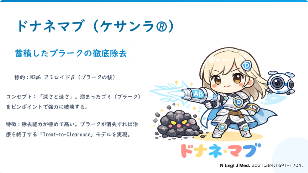 #7. ドナネマブ (ケサンラ🄬) 蓄積したプラークの徹底除去 標的:N3pG アミロイドβ(プラークの核) コンセプト:「深さと速さ」。溜まったゴミ(プラーク)をピンポイントで強力に破壊する。 特徴:除去能力が極めて高い。プラークが消失すれば治療を終了する「Treat-to-Clearance」モデルを実現。 N Engl J Med. 2021;384:1691-1704.