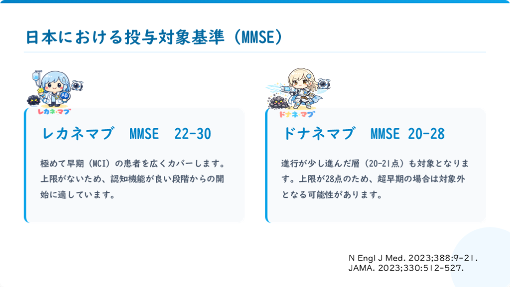 #8. 日本における投与対象基準 (MMSE) レカネマブ MMSE 22-30 極めて早期(MCI)の患者を広くカバーします。上限がないため、認知機能が良い段階からの開始に適しています。 ドナネマブ MMSE 20-28 進行が少し進んだ層(20-21点)も対象となります。上限が28点のため、超早期の場合は対象外となる可能性があります。 N Engl J Med. 2023;388:9-21.