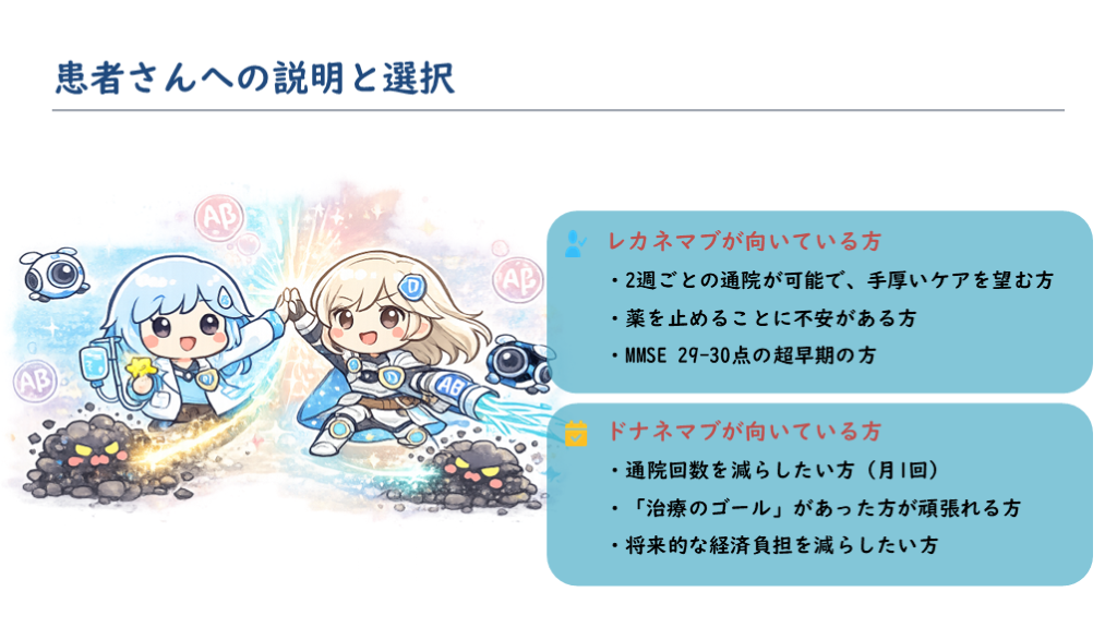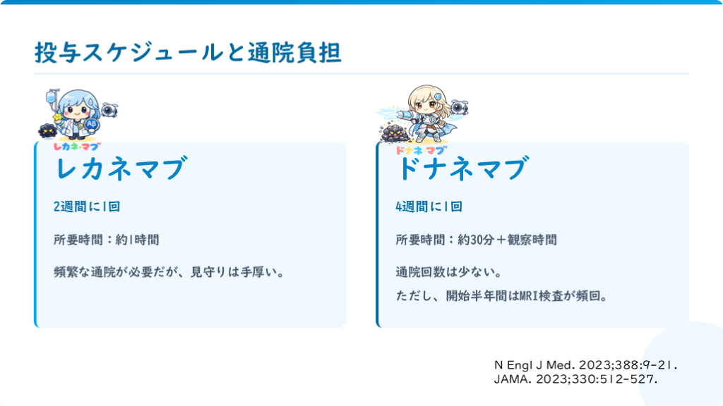 #9. 投与スケジュールと通院負担 レカネマブ 2週間に1回 所要時間:約1時間 頻繁な通院が必要だが、見守りは手厚い。 ドナネマブ 4週間に1回 所要時間:約30分+観察時間 通院回数は少ない。