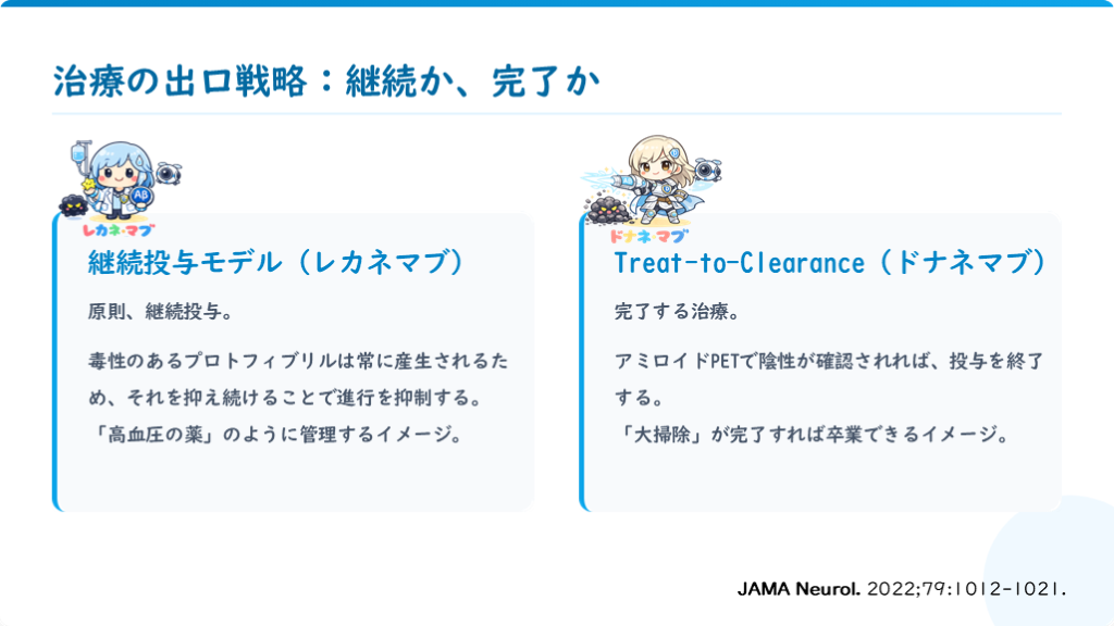 「高血圧の薬」のように管理するイメージ。 Treat-to-Clearance (ドナネマブ) 完了する治療。 アミロイドPETで陰性が確認されれば、投与を終了する。