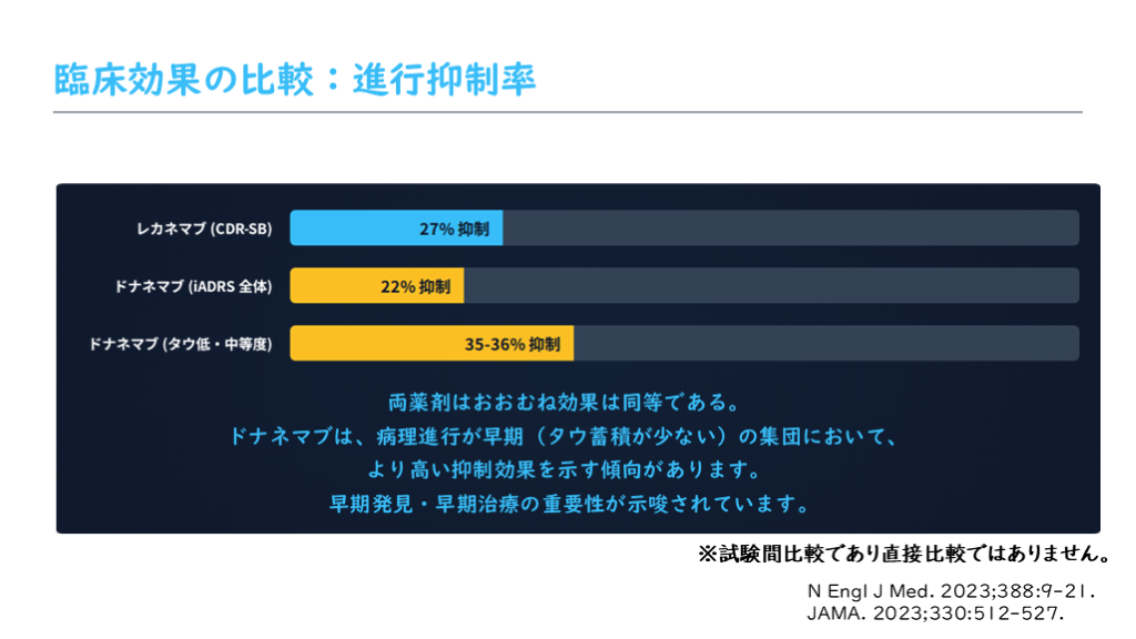 より高い抑制効果を示す傾向があります。 早期発見・早期治療の重要性が示唆されています。 臨床効果の比較:進行抑制率 N Engl J Med. 2023;388:9-21.