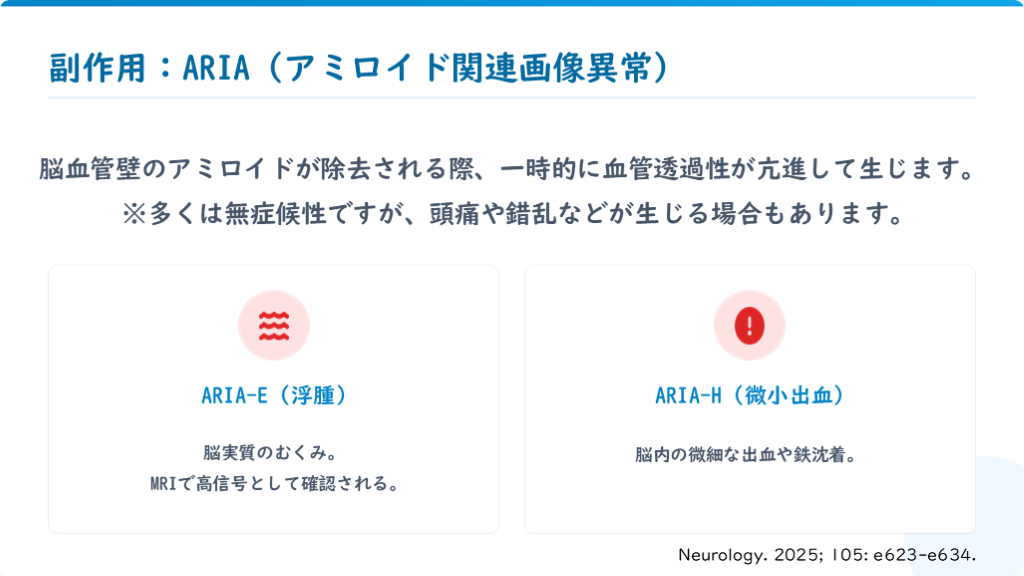 #15. 副作用:ARIA (アミロイド関連画像異常) 脳血管壁のアミロイドが除去される際、一時的に血管透過性が亢進して生じます。 ※多くは無症候性ですが、頭痛や錯乱などが生じる場合もあります。 ARIA-E (浮腫) 脳実質のむくみ。 MRIで高信号として確認される。 ARIA-H (微小出血) 脳内の微細な出血や鉄沈着。 Neurology. 2025; 105: e623-e634.