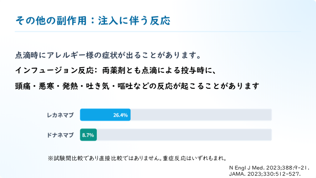 頭痛・悪寒・発熱・吐き気・嘔吐などの反応が起こることがあります その他の副作用:注入に伴う反応 ※試験間比較であり直接比較ではありません。重症反応はいずれもまれ。 N Engl J Med. 2023;388:9-21.