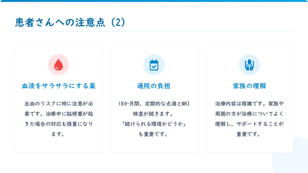 #20. 患者さんへの注意点 (2) 血液をサラサラにする薬 出血のリスクに特に注意が必要です。治療中に脳梗塞が起きた場合の対応も慎重になります。 通院の負担 18か月間、定期的な点滴とMRI検査が続きます。
