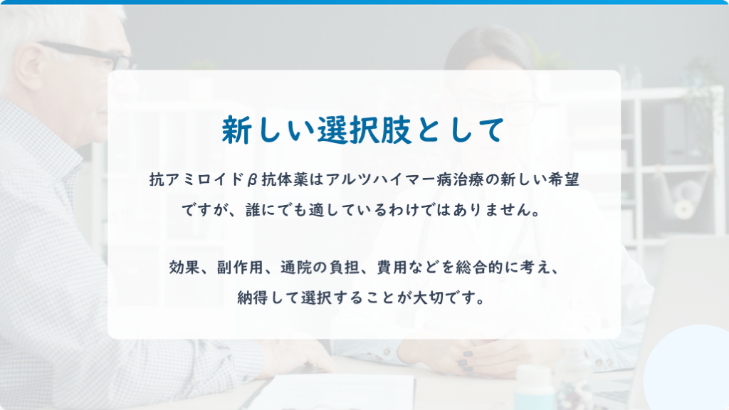 #21. 新しい選択肢として 抗アミロイドβ抗体薬はアルツハイマー病治療の新しい希望ですが、誰にでも適しているわけではありません。 効果、副作用、通院の負担、費用などを総合的に考え、