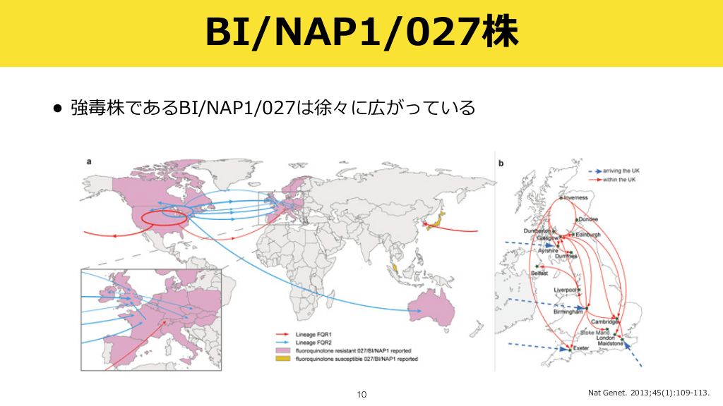 #10. BI/NAP1/027株 • 強毒株であるBI/NAP1/027は徐々に広がっている 10 Nat Genet. 2013;45(1):109-113.