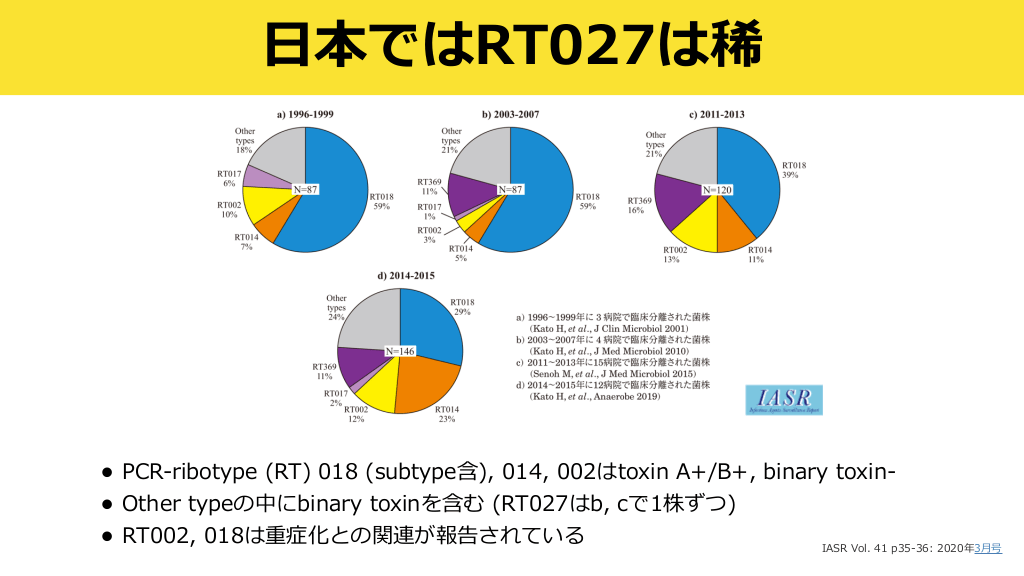 #11. ⽇本ではRT027は稀 • • • PCR-ribotype (RT) 018 (subtype含), 014, 002はtoxin A+/B+, binary toxinOther typeの中にbinary toxinを含む (RT027はb, cで1株ずつ) RT002, 018は重症化との関連が報告されている IASR Vol. 41 p35-36: 2020年3⽉号
