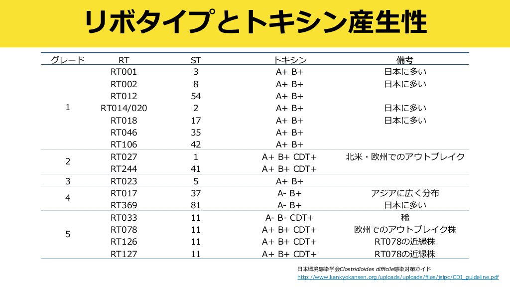 #12. リボタイプとトキシン産⽣性 グレード 1 2 3 4 5 RT RT001 RT002 RT012 RT014/020 RT018 RT046 RT106 RT027 RT244 RT023 RT017 RT369 RT033 RT078 RT126 RT127 ST 3 8 54 2 17 35 42 1 41 5 37 81 11 11 11 11 トキシン A+ B+ A+ B+ A+ B+ A+ B+ A+ B+ A+ B+ A+ B+ A+ B+ CDT+ A+ B+ CDT+ A+ B+ A- B+ A- B+ A- B- CDT+ A+ B+ CDT+ A+ B+ CDT+ A+ B+ CDT+ 備考 ⽇本に多い ⽇本に多い ⽇本に多い ⽇本に多い 北⽶・欧州でのアウトブレイク アジアに広く分布 ⽇本に多い 稀 欧州でのアウトブレイク株 RT078の近縁株 RT078の近縁株 fi ffi ⽇本環境感染学会Clostridioides di cile感染対策ガイド http://www.kankyokansen.org/uploads/uploads/ les/jsipc/CDI_guideline.pdf