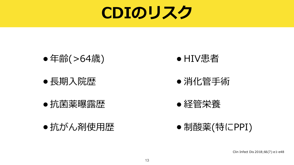 #13. CDIのリスク • 年齢(>64歳) • HIV患者 • ⻑期⼊院歴 • 消化管⼿術 • 抗菌薬曝露歴 • 経管栄養 • 抗がん剤使⽤歴 • 制酸薬(特にPPI) Clin Infect Dis 2018;66(7):e1-e48 13