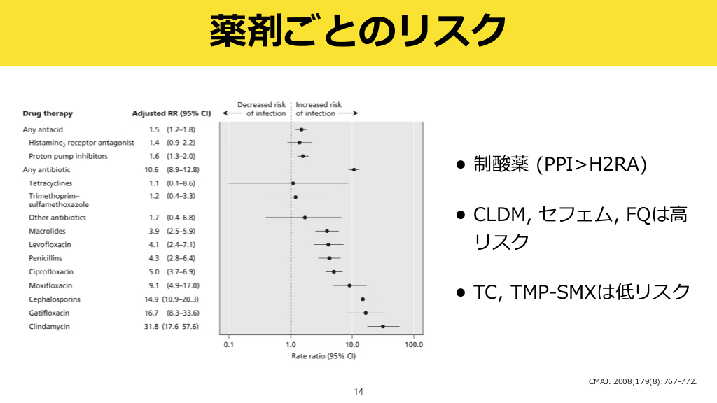 #14. 薬剤ごとのリスク • 制酸薬 (PPI>H2RA) • CLDM, セフェム, FQは⾼ リスク • TC, TMP-SMXは低リスク 14 CMAJ. 2008;179(8):767-772.