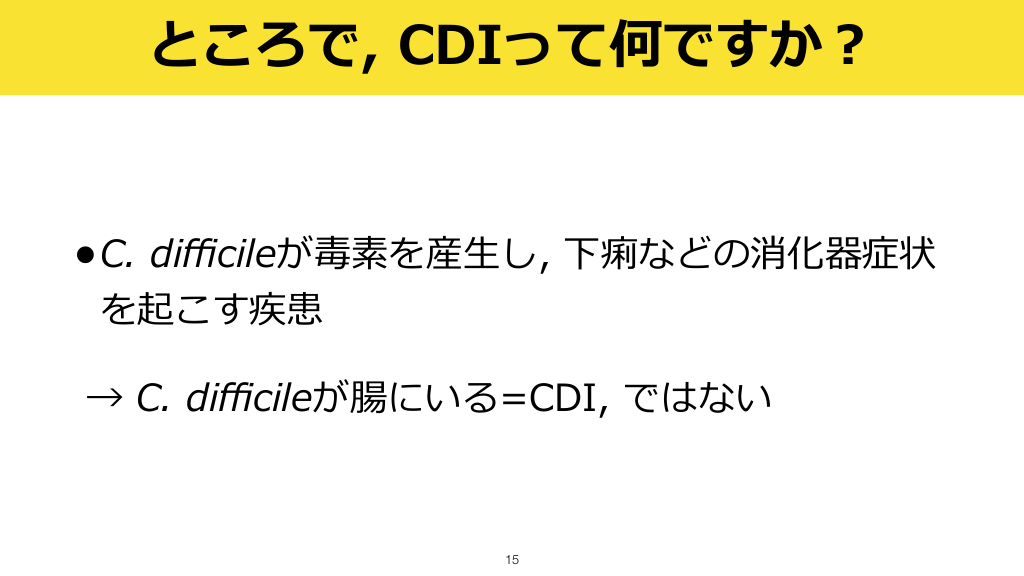 #15. ところで, CDIって何ですか? • C. di cileが毒素を産⽣し, 下痢などの消化器症状 を起こす疾患 → C. di cileが腸にいる=CDI, ではない ffi ffi 15