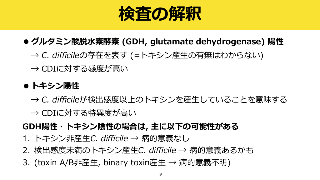 #16. 検査の解釈 • グルタミン酸脱⽔素酵素 (GDH, glutamate dehydrogenase) 陽性 → C. di cileの存在を表す (=トキシン産⽣の有無はわからない) → CDIに対する感度が⾼い • トキシン陽性 → C. di cileが検出感度以上のトキシンを産⽣していることを意味する → CDIに対する特異度が⾼い GDH陽性・トキシン陰性の場合は, 主に以下の可能性がある 1. トキシン⾮産⽣C. di cile → 病的意義なし 2. 検出感度未満のトキシン産⽣C. di cile → 病的意義あるかも 3. (toxin A/B⾮産⽣, binary toxin産⽣ → 病的意義不明) ffi ffi ffi ffi 16