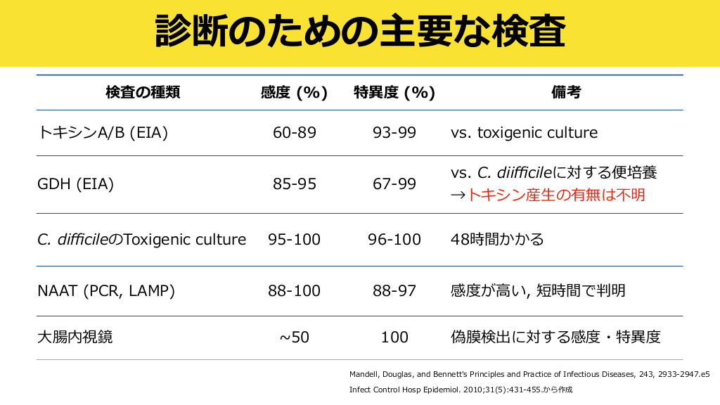 #17. 診断のための主要な検査 検査の種類 感度 (%) 特異度 (%) 60-89 93-99 vs. toxigenic culture 85-95 67-99 vs. C. dii cileに対する便培養 →トキシン産⽣の有無は不明 C. di cileのToxigenic culture 95-100 96-100 NAAT (PCR, LAMP) 88-100 88-97 ~50 100 トキシンA/B (EIA) GDH (EIA) ⼤腸内視鏡 備考 48時間かかる 感度が⾼い, 短時間で判明 偽膜検出に対する感度・特異度 Mandell, Douglas, and Bennett's Principles and Practice of Infectious Diseases, 243, 2933-2947.e5 ffi ffi Infect Control Hosp Epidemiol. 2010;31(5):431-455.から作成