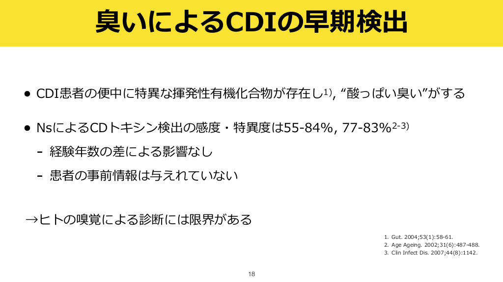 #18. 臭いによるCDIの早期検出 • CDI患者の便中に特異な揮発性有機化合物が存在し1), “酸っぱい臭い”がする • NsによるCDトキシン検出の感度・特異度は55-84%, 77-83%2-3) - 経験年数の差による影響なし - 患者の事前情報は与えれていない →ヒトの嗅覚による診断には限界がある 1. Gut. 2004;53(1):58-61. 2. Age Ageing. 2002;31(6):487-488. 3. Clin Infect Dis. 2007;44(8):1142. 18