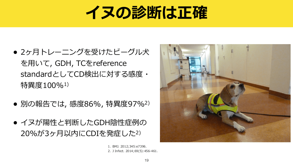 #19. イヌの診断は正確 • 2ヶ⽉トレーニングを受けたビーグル⽝ を⽤いて, GDH, TCをreference standardとしてCD検出に対する感度・ 特異度100%1) • 別の報告では, 感度86%, 特異度97%2) • イヌが陽性と判断したGDH陰性症例の 20%が3ヶ⽉以内にCDIを発症した2) 1. BMJ. 2012;345:e7396. 2. J Infect. 2014;69(5):456-461. 19