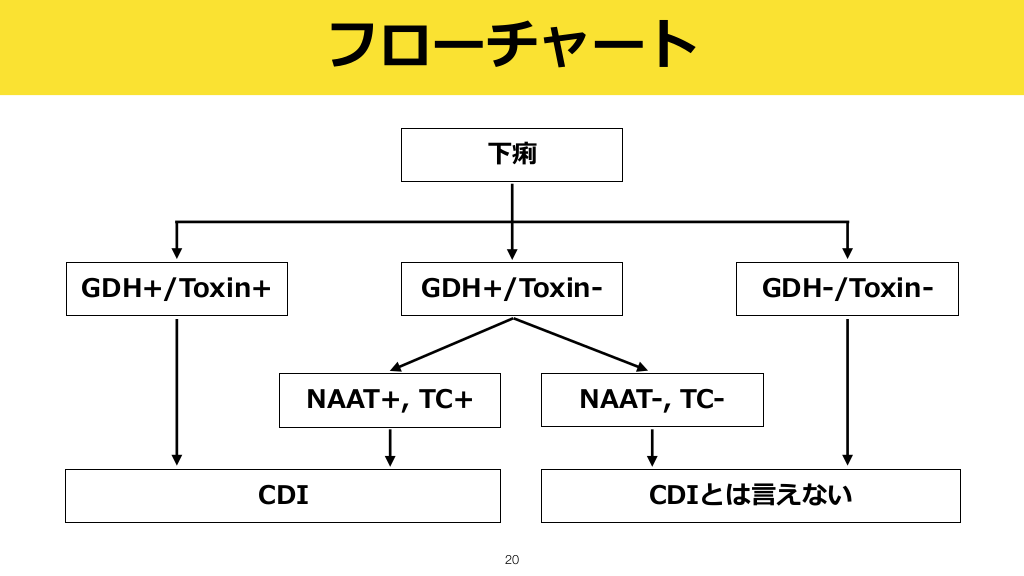 #20. フローチャート 下痢 GDH+/Toxin+ GDH+/Toxin- GDH-/Toxin- NAAT-, TC- NAAT+, TC+ CDI CDIとは⾔えない 20