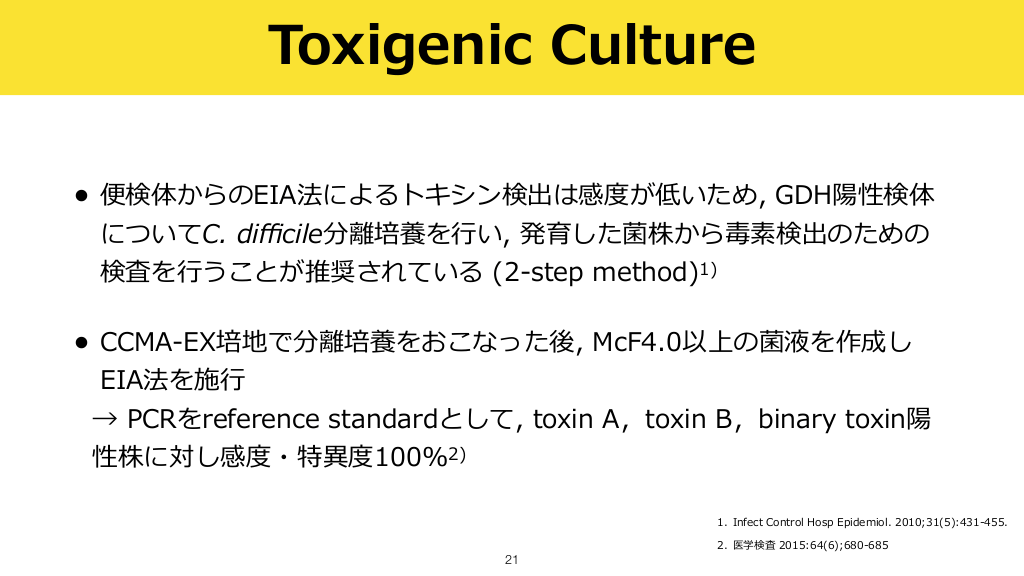#21. Toxigenic Culture EIA • 便検体からのEIA法によるトキシン検出は感度が低いため, GDH陽性検体 についてC. di cile分離培養を⾏い, 発育した菌株から毒素検出のための 検査を⾏うことが推奨されている (2-step method)1) • CCMA-EX培地で分離培養をおこなった後, McF4.0以上の菌液を作成し EIA法を施⾏ → PCRをreference standardとして, toxin A,toxin B,binary toxin陽 性株に対し感度・特異度100%2) 1. Infect Control Hosp Epidemiol. 2010;31(5):431-455. ffi 21 2. 医学検査 2015:64(6);680-685