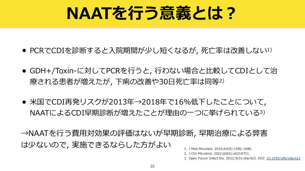 #22. NAATを⾏う意義とは? • PCRでCDIを診断すると⼊院期間が少し短くなるが, 死亡率は改善しない1) • GDH+/Toxin-に対してPCRを⾏うと, ⾏わない場合と⽐較してCDIとして治 療される患者が増えたが, 下痢の改善や30⽇死亡率は同等2) • ⽶国でCDI再発リスクが2013年→2018年で16%低下したことについて, NAATによるCDI早期診断が増えたことが理由の⼀つに挙げられている3) →NAATを⾏う費⽤対効果の評価はないが早期診断, 早期治療による弊害 は少ないので, 実施できるならした⽅がよい 1. J Med Microbiol. 2015;64(9):1082-1086. 2. J Clin Microbiol. 2022;60(6):e0218721. 3. Open Forum Infect Dis. 2022;9(9):ofac422. DOI: 10.1093/o d/ofac422 fi 22