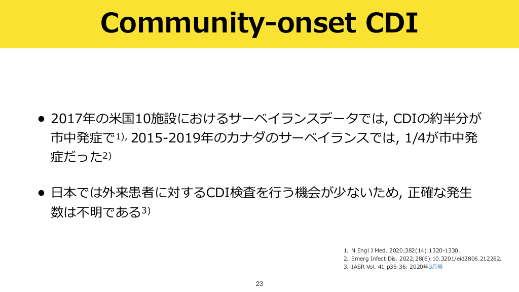 #23. Community-onset CDI • 2017年の⽶国10施設におけるサーベイランスデータでは, CDIの約半分が 市中発症で1), 2015-2019年のカナダのサーベイランスでは, 1/4が市中発 症だった2) • ⽇本では外来患者に対するCDI検査を⾏う機会が少ないため, 正確な発⽣ 数は不明である3) 1. N Engl J Med. 2020;382(14):1320-1330. 2. Emerg Infect Dis. 2022;28(6):10.3201/eid2806.212262. 3. IASR Vol. 41 p35-36: 2020年3⽉号 23