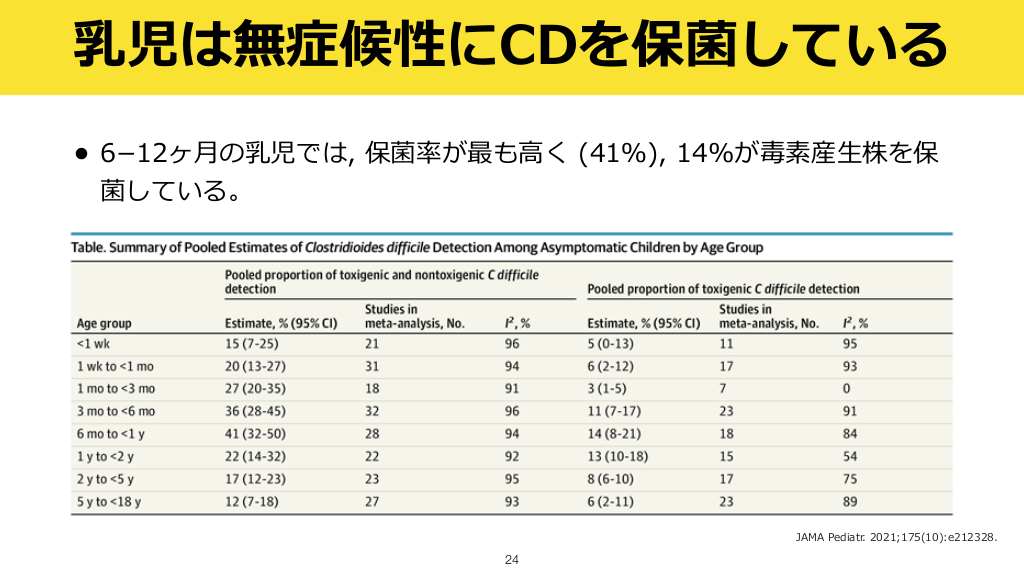 #24. 乳児は無症候性にCDを保菌している • 612ヶ⽉の乳児では, 保菌率が最も⾼く (41%), 14%が毒素産⽣株を保 菌している。 JAMA Pediatr. 2021;175(10):e212328. 24