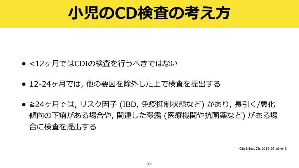 #25. ⼩児のCD検査の考え⽅ • <12ヶ⽉ではCDIの検査を⾏うべきではない • 12-24ヶ⽉では, 他の要因を除外した上で検査を提出する • ≧24ヶ⽉では, リスク因⼦ (IBD, 免疫抑制状態など) があり, ⻑引く/悪化 傾向の下痢がある場合や, 関連した曝露 (医療機関や抗菌薬など) がある場 合に検査を提出する Clin Infect Dis 2018;66:e1-e48 25