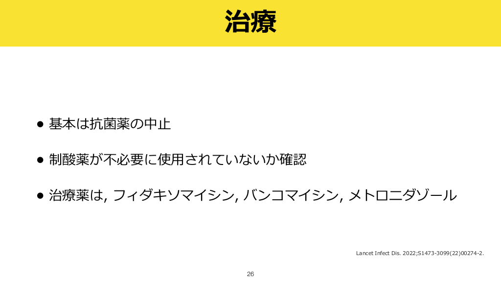 #26. 治療 • 基本は抗菌薬の中⽌ • 制酸薬が不必要に使⽤されていないか確認 • 治療薬は, フィダキソマイシン, バンコマイシン, メトロニダゾール Lancet Infect Dis. 2022;S1473-3099(22)00274-2. 26