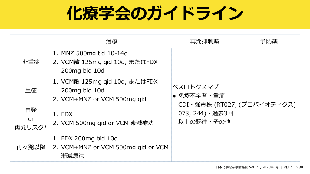 #27. 化療学会のガイドライン 治療 ⾮重症 200mg bid 10d 2. VCM+MNZ or VCM 500mg qid 再発 1. FDX or 2. VCM 500mg qid or VCM 漸減療法 再発リスク* 再々発以降 予防薬 1. MNZ 500mg tid 10-14d 2. VCM散 125mg qid 10d, またはFDX 200mg bid 10d 1. VCM散 125mg qid 10d, またはFDX 重症 再発抑制薬 ベスロトクスマブ • 免疫不全者・重症 CDI・強毒株 (RT027, (プロバイオティクス) 078, 244)・過去3回 以上の既往・その他 1. FDX 200mg bid 10d 2. VCM+MNZ or VCM 500mg qid or VCM 漸減療法 ⽇本化学療法学会雑誌 Vol. 71, 2023年1号(1⽉)p.1〜90