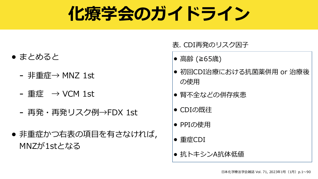 #28. 化療学会のガイドライン • 表. CDI再発のリスク因⼦ まとめると • ⾼齢 (≧65歳) - ⾮重症→ MNZ 1st • - 初回CDI治療における抗菌薬併⽤ or 治療後 の使⽤ 重症 • 腎不全などの併存疾患 • CDIの既往 • PPIの使⽤ • 重症CDI • 抗トキシンA抗体低値 • → VCM 1st 再発・再発リスク例→FDX 1st ⾮重症かつ右表の項⽬を有さなければ, MNZが1stとなる ⽇本化学療法学会雑誌 Vol. 71, 2023年1号(1⽉)p.1〜90