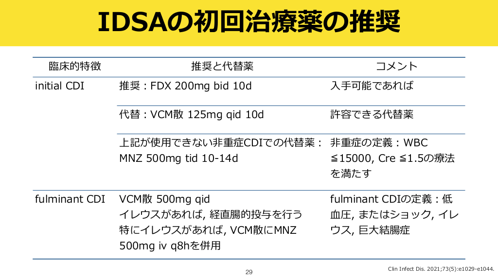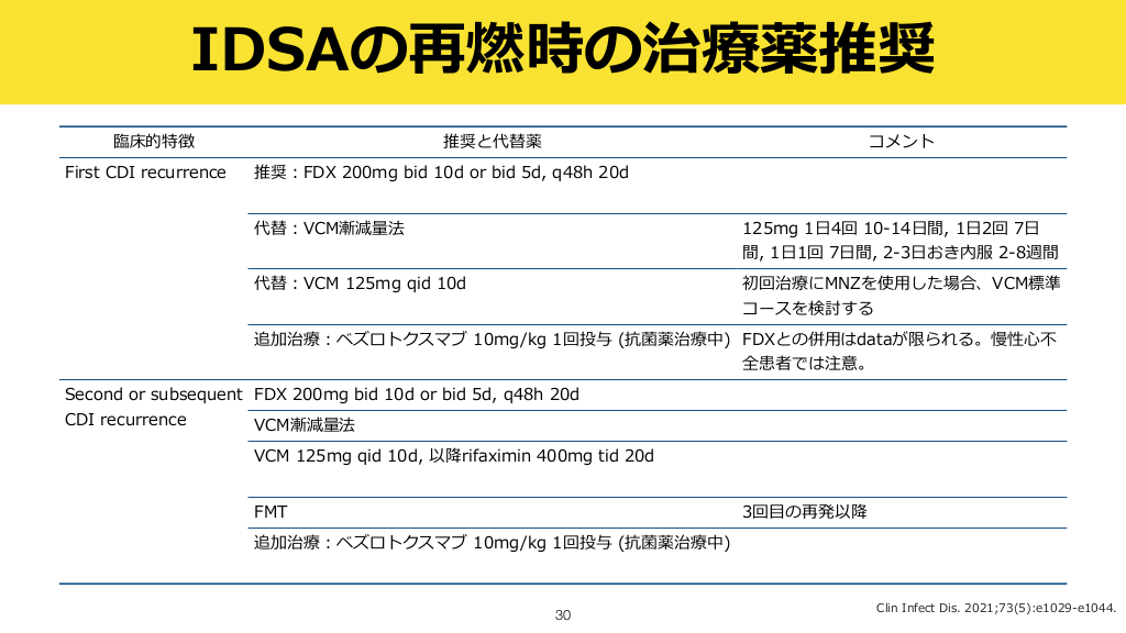 #29. IDSAの初回治療薬の推奨 臨床的特徴 initial CDI 推奨と代替薬 コメント 推奨:FDX 200mg bid 10d ⼊⼿可能であれば 代替:VCM散 125mg qid 10d 許容できる代替薬 上記が使⽤できない⾮重症CDIでの代替薬: ⾮重症の定義:WBC fulminant CDI MNZ 500mg tid 10-14d ≦15000, Cre ≦1.5の療法 を満たす VCM散 500mg qid イレウスがあれば, 経直腸的投与を⾏う 特にイレウスがあれば, VCM散にMNZ 500mg iv q8hを併⽤ fulminant CDIの定義:低 ⾎圧, またはショック, イレ ウス, 巨⼤結腸症 29 Clin Infect Dis. 2021;73(5):e1029-e1044.