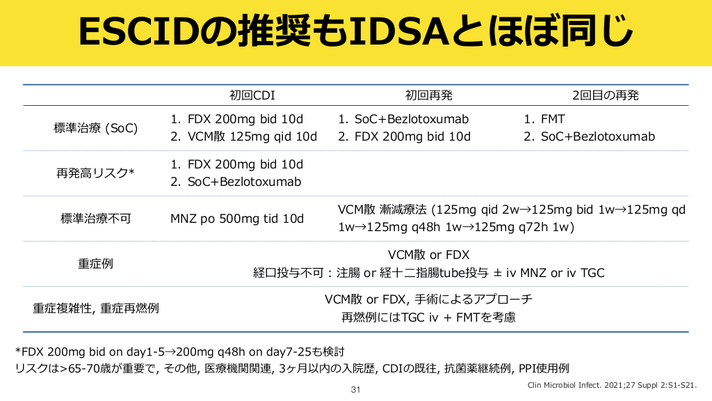 #30. IDSAの再燃時の治療薬推奨 臨床的特徴 First CDI recurrence 推奨と代替薬 コメント 推奨:FDX 200mg bid 10d or bid 5d, q48h 20d 代替:VCM漸減量法 125mg 1⽇4回 10-14⽇間, 1⽇2回 7⽇ 間, 1⽇1回 7⽇間, 2-3⽇おき内服 2-8週間 代替:VCM 125mg qid 10d 初回治療にMNZを使⽤した場合、VCM標準 コースを検討する 追加治療:ベズロトクスマブ 10mg/kg 1回投与 (抗菌薬治療中) FDXとの併⽤はdataが限られる。慢性⼼不 全患者では注意。 Second or subsequent FDX 200mg bid 10d or bid 5d, q48h 20d CDI recurrence VCM漸減量法 VCM 125mg qid 10d, 以降rifaximin 400mg tid 20d FMT 3回⽬の再発以降 追加治療:ベズロトクスマブ 10mg/kg 1回投与 (抗菌薬治療中) 30 Clin Infect Dis. 2021;73(5):e1029-e1044.