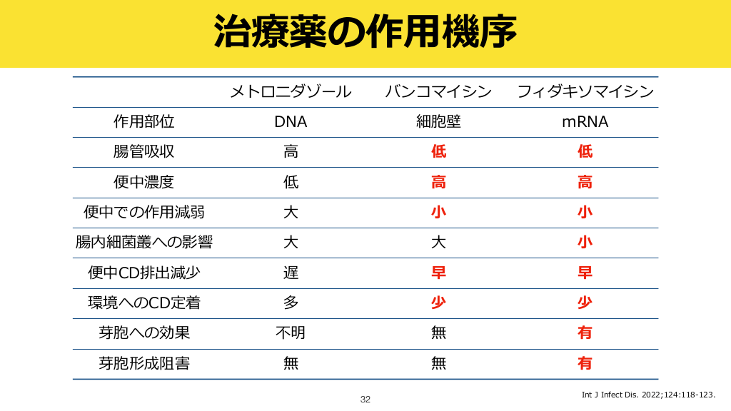 #32. 治療薬の作⽤機序 メトロニダゾール バンコマイシン フィダキソマイシン 作⽤部位 DNA 細胞壁 mRNA 腸管吸収 ⾼ 低 低 便中濃度 低 ⾼ ⾼ 便中での作⽤減弱 ⼤ ⼩ ⼩ 腸内細菌叢への影響 ⼤ ⼤ ⼩ 便中CD排出減少 遅 早 早 環境へのCD定着 多 少 少 芽胞への効果 不明 無 有 芽胞形成阻害 無 無 有 32 Int J Infect Dis. 2022;124:118-123.