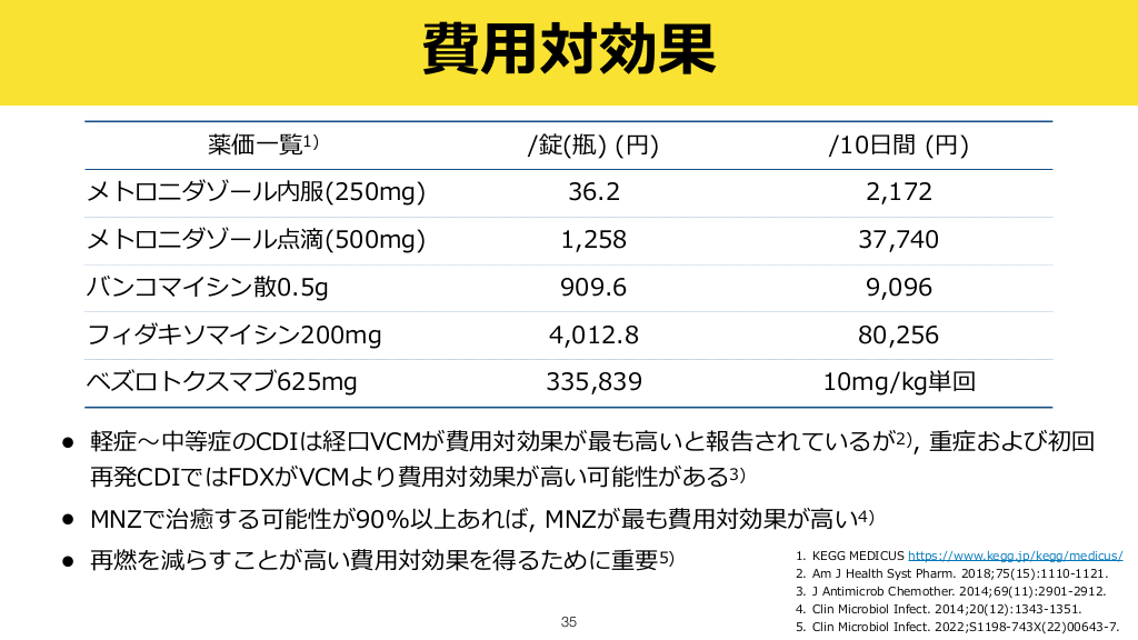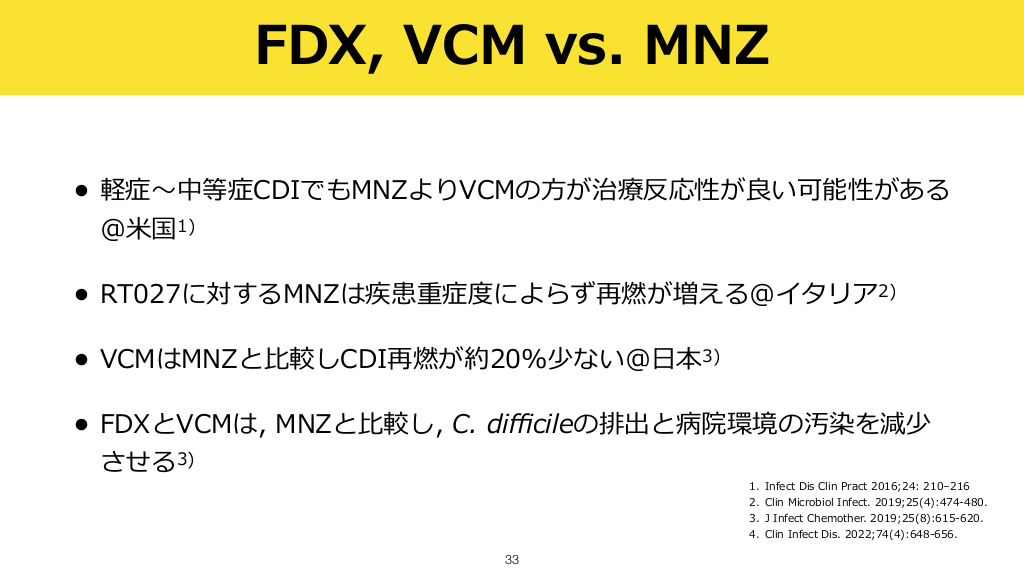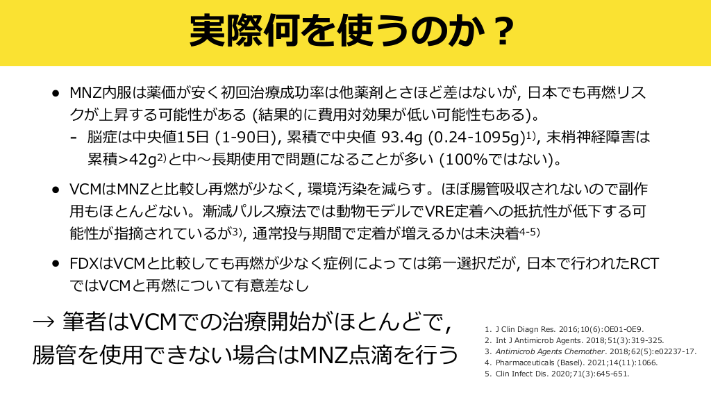 #36. 実際何を使うのか? • MNZ内服は薬価が安く初回治療成功率は他薬剤とさほど差はないが, ⽇本でも再燃リス クが上昇する可能性がある (結果的に費⽤対効果が低い可能性もある)。 - 脳症は中央値15⽇ (1-90⽇), 累積で中央値 93.4g (0.24-1095g)1), 末梢神経障害は 累積>42g2)と中〜⻑期使⽤で問題になることが多い (100%ではない)。 • VCMはMNZと⽐較し再燃が少なく, 環境汚染を減らす。ほぼ腸管吸収されないので副作 ⽤もほとんどない。漸減パルス療法では動物モデルでVRE定着への抵抗性が低下する可 能性が指摘されているが3), 通常投与期間で定着が増えるかは未決着4-5) • FDXはVCMと⽐較しても再燃が少なく症例によっては第⼀選択だが, ⽇本で⾏われたRCT ではVCMと再燃について有意差なし → 筆者はVCMでの治療開始がほとんどで, 腸管を使⽤できない場合はMNZ点滴を⾏う 1. 2. 3. 4. 5. J Clin Diagn Res. 2016;10(6):OE01-OE9. Int J Antimicrob Agents. 2018;51(3):319-325. Antimicrob Agents Chemother. 2018;62(5):e02237-17. Pharmaceuticals (Basel). 2021;14(11):1066. Clin Infect Dis. 2020;71(3):645-651.