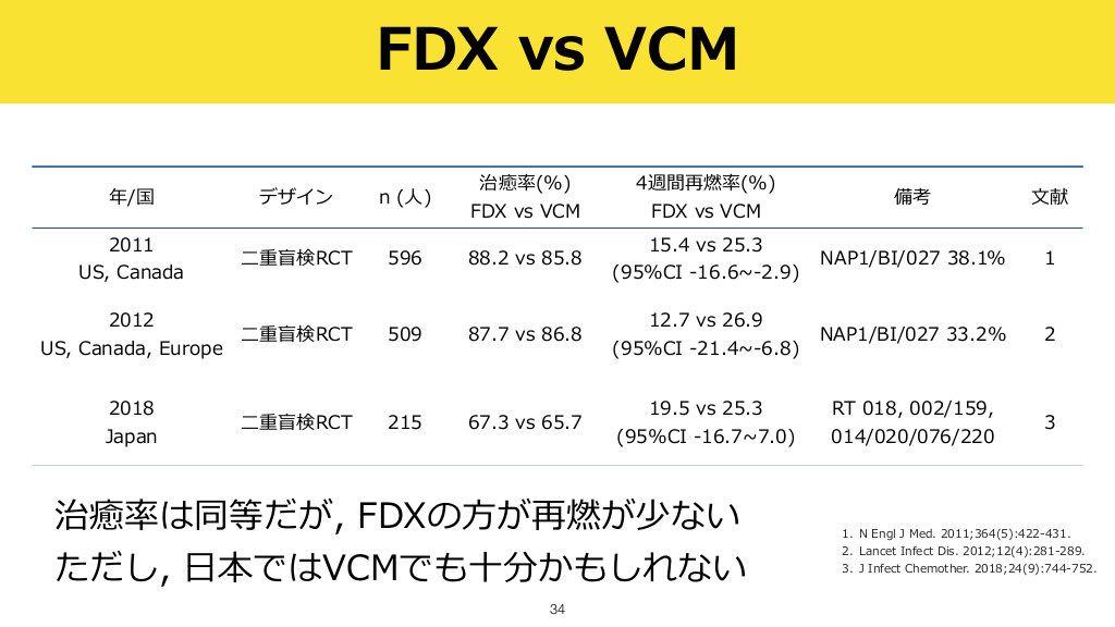 #34. FDX vs VCM 年/国 2011 US, Canada 2012 US, Canada, Europe 2018 Japan デザイン ⼆重盲検RCT ⼆重盲検RCT ⼆重盲検RCT n (⼈) 596 509 215 治癒率(%) FDX vs VCM 4週間再燃率(%) FDX vs VCM 備考 ⽂献 88.2 vs 85.8 15.4 vs 25.3 (95%CI -16.6~-2.9) NAP1/BI/027 38.1% 1 NAP1/BI/027 33.2% 2 RT 018, 002/159, 014/020/076/220 3 87.7 vs 86.8 67.3 vs 65.7 12.7 vs 26.9 (95%CI -21.4~-6.8) 19.5 vs 25.3 (95%CI -16.7~7.0) 治癒率は同等だが, FDXの⽅が再燃が少ない ただし, ⽇本ではVCMでも⼗分かもしれない 34 1. N Engl J Med. 2011;364(5):422-431. 2. Lancet Infect Dis. 2012;12(4):281-289. 3. J Infect Chemother. 2018;24(9):744-752.