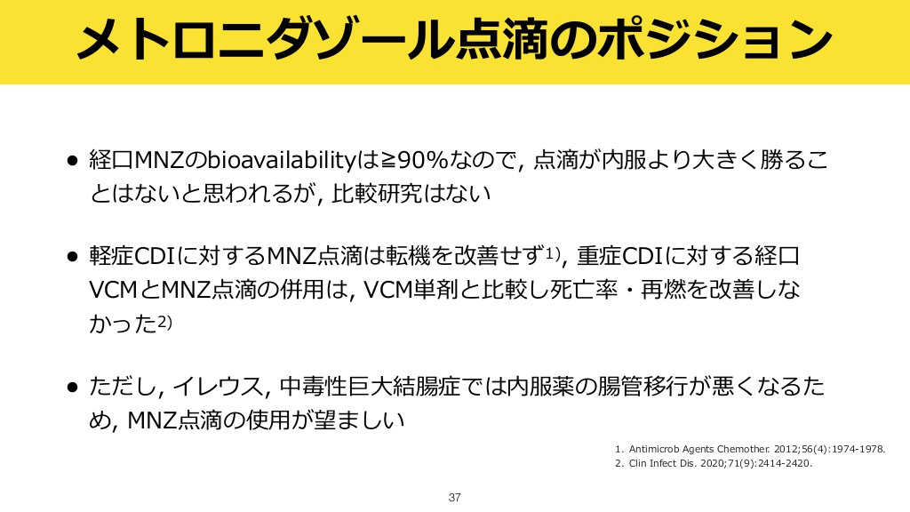 #37. メトロニダゾール点滴のポジション • 経⼝MNZのbioavailabilityは≧90%なので, 点滴が内服より⼤きく勝るこ とはないと思われるが, ⽐較研究はない • 軽症CDIに対するMNZ点滴は転機を改善せず1), 重症CDIに対する経⼝ VCMとMNZ点滴の併⽤は, VCM単剤と⽐較し死亡率・再燃を改善しな かった2) • ただし, イレウス, 中毒性巨⼤結腸症では内服薬の腸管移⾏が悪くなるた め, MNZ点滴の使⽤が望ましい 1. Antimicrob Agents Chemother. 2012;56(4):1974-1978. 2. Clin Infect Dis. 2020;71(9):2414-2420. 37