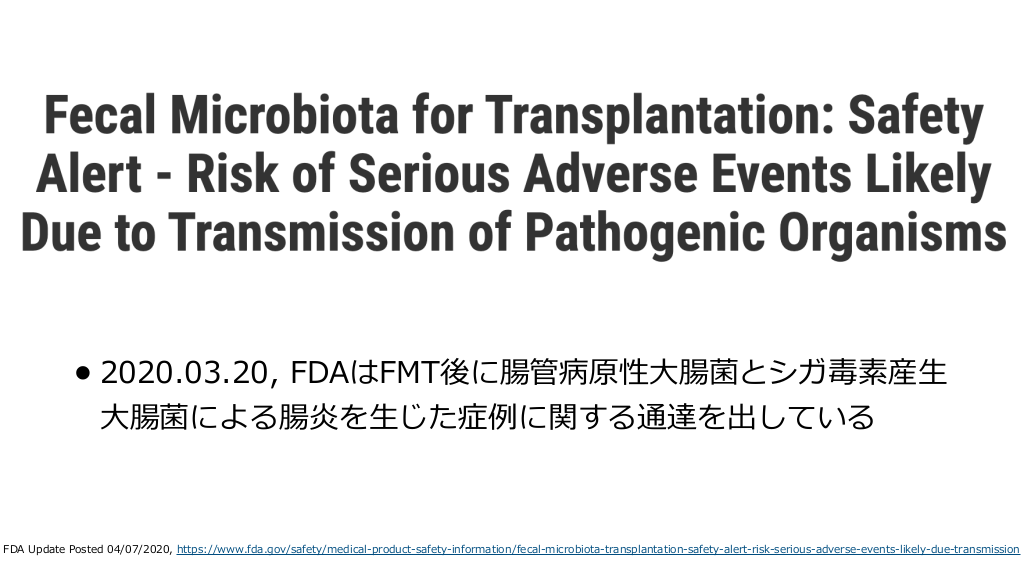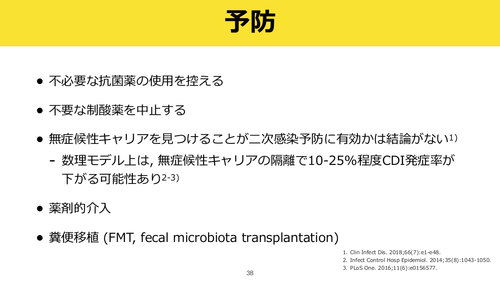 #38. 予防 • 不必要な抗菌薬の使⽤を控える • 不要な制酸薬を中⽌する • 無症候性キャリアを⾒つけることが⼆次感染予防に有効かは結論がない1) - 数理モデル上は, 無症候性キャリアの隔離で10-25%程度CDI発症率が 下がる可能性あり2-3) • 薬剤的介⼊ • 糞便移植 (FMT, fecal microbiota transplantation) 38 1. Clin Infect Dis. 2018;66(7):e1-e48. 2. Infect Control Hosp Epidemiol. 2014;35(8):1043-1050. 3. PLoS One. 2016;11(6):e0156577.