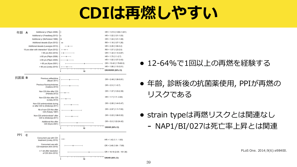 #39. CDIは再燃しやすい 年齢 抗菌薬 PPI • 12-64%で1回以上の再燃を経験する • 年齢, 診断後の抗菌薬使⽤, PPIが再燃の リスクである • strain typeは再燃リスクとは関連なし - NAP1/BI/027は死亡率上昇とは関連 PLoS One. 2014;9(6):e98400. 39