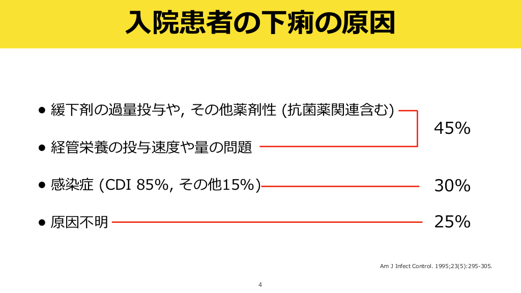 #4. ⼊院患者の下痢の原因 • 緩下剤の過量投与や, その他薬剤性 (抗菌薬関連含む) • 経管栄養の投与速度や量の問題 45% • 感染症 (CDI 85%, その他15%) 30% • 原因不明 25% Am J Infect Control. 1995;23(5):295-305. 4