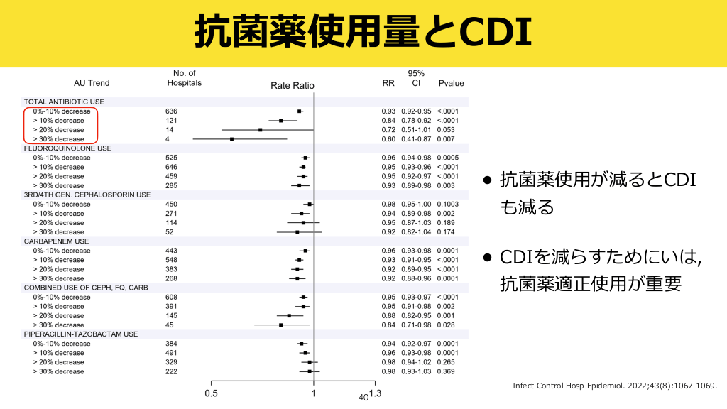 #40. 抗菌薬使⽤量とCDI 40 • 抗菌薬使⽤が減るとCDI も減る • CDIを減らすためにいは, 抗菌薬適正使⽤が重要 Infect Control Hosp Epidemiol. 2022;43(8):1067-1069.