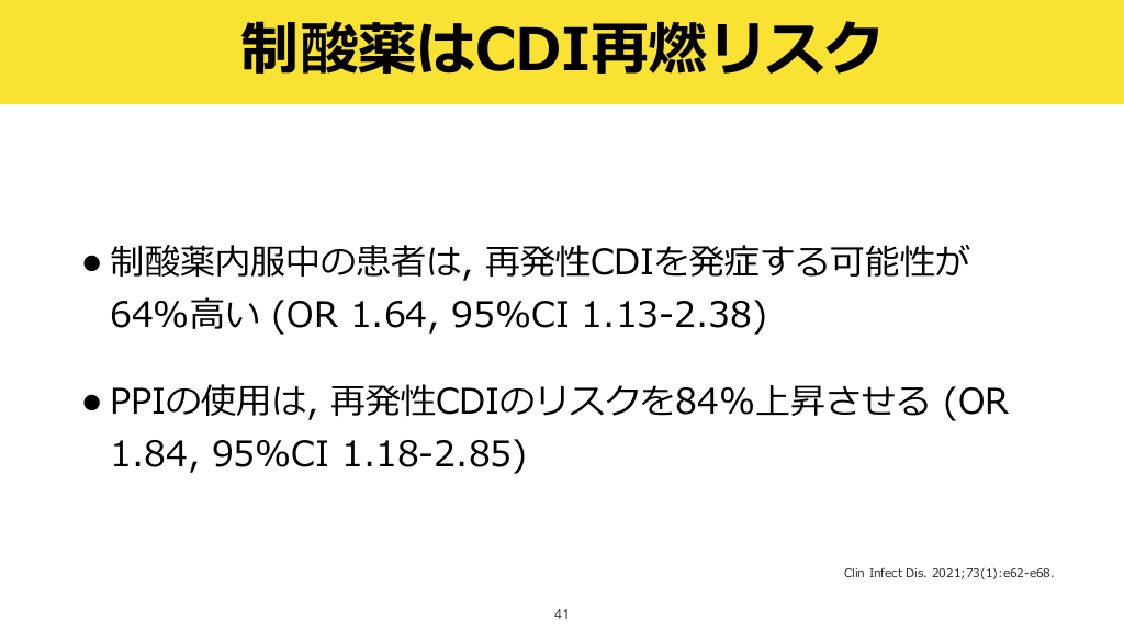 #41. 制酸薬はCDI再燃リスク • 制酸薬内服中の患者は, 再発性CDIを発症する可能性が 64%⾼い (OR 1.64, 95%CI 1.13-2.38) • PPIの使⽤は, 再発性CDIのリスクを84%上昇させる (OR 1.84, 95%CI 1.18-2.85) Clin Infect Dis. 2021;73(1):e62-e68. 41